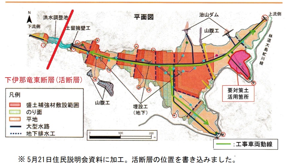 〇 *4 JR東海は5月21日に豊丘村内で村民対象の説明会を開きました。漏れて人が飲んだとしてもほとんど影響がないといった誤解を与えるような説明もありました。有害物を含む残土に不溶化という処理をしてシートにくるんで埋めるので大丈夫といいつつ、漏れた場合に備え水槽を設けるなど説明していますが、これらの方策がいつまで有効なのかその期間については、住民のくらしが続いていく、何百年という長さからいえば、ほとんど比べ物にならないはずです。