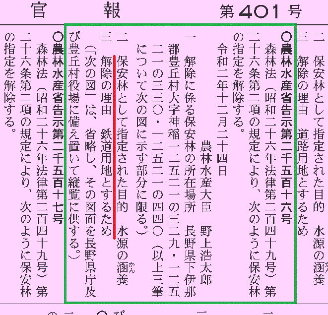 〇 *2 JR東海の保安林指定解除の申請について2020年6月2日に飯田市内で長野県森林審議会保全部会が行われました。傍聴者への配布資料のなかに、解除予定保安林の概要について書いた部分がありました。